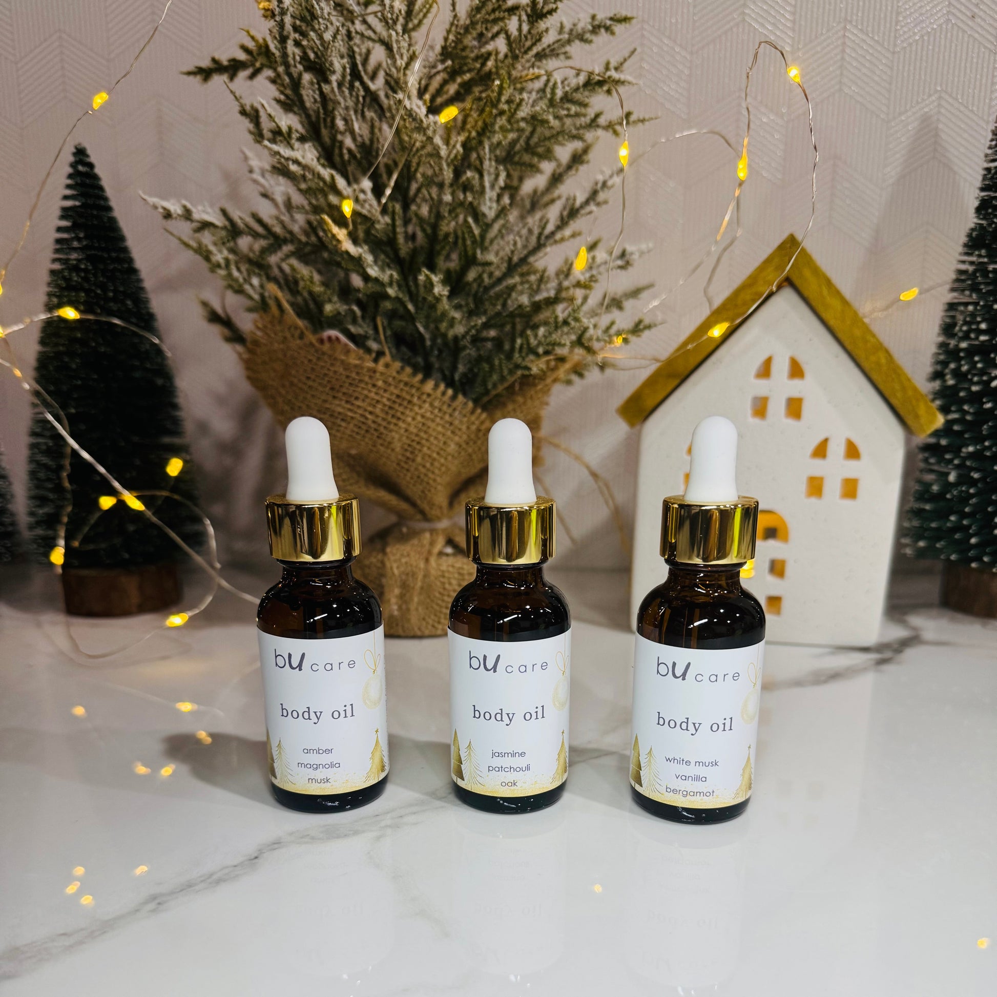 Celebrate the season with our luxurious Holiday Body Oil Trio — a festive collection of three 1oz body oils inspired by your favorite holiday scents. Each oil is handcrafted with a nourishing blend of natural oils that deeply hydrates, leaving your skin soft, smooth, and glowing. Housed in elegant glass bottles with glass droppers for easy application, this beautifully packaged trio makes a perfect gift or a pampering treat to add a touch of holiday magic to your daily routine.