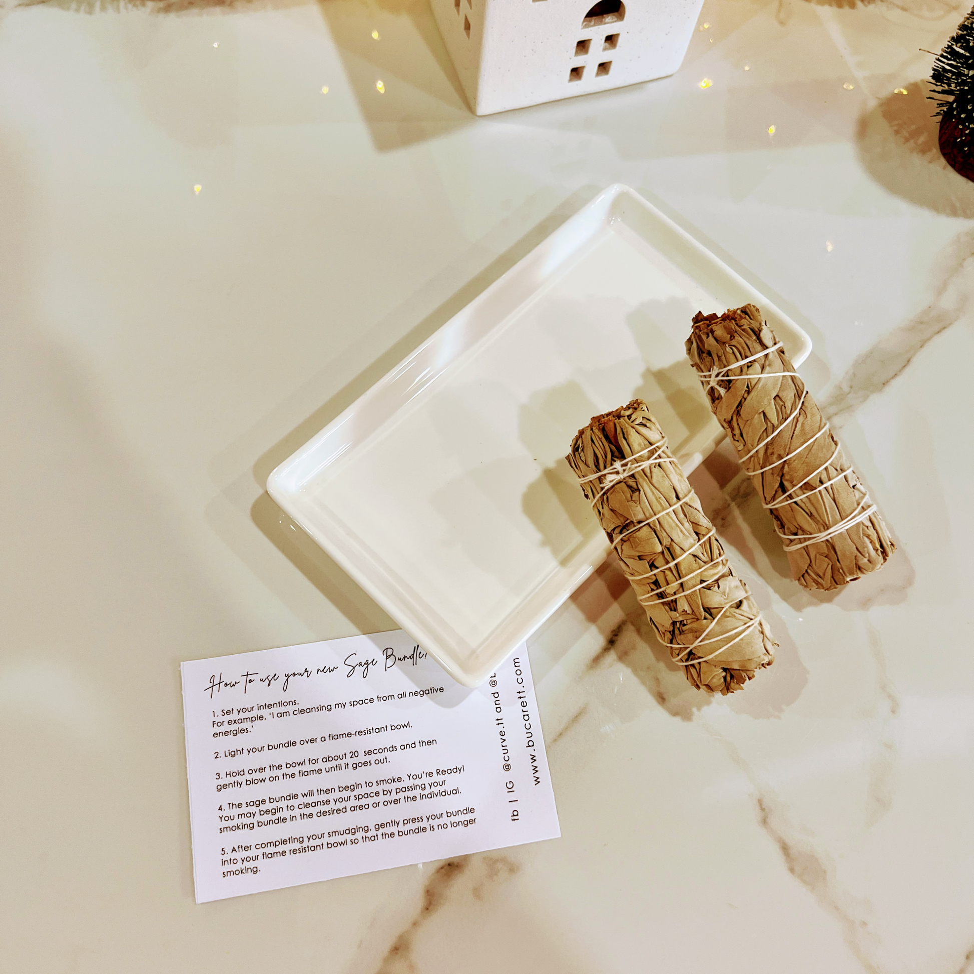 This Holiday Bundle comes gift boxed with two (2) Organic California White Sage Bundles paired with a white rectangular, ceramic dish for smudging.